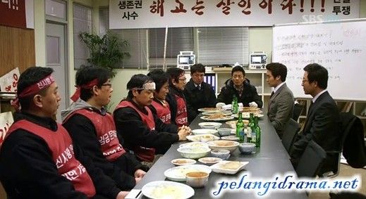 "Kalau kau memang ingin membantu, kembalikan mereka semua kekeadaan semula, biar kulihat dengan mata kepalaku sendiri. Semua orang yang telah meninggalkan pabrik..."cerocos Yoo Bang yang langsung dibentak Hang Woo. "Ini bukan tempatmu bicara !"seru Hang Woo. Beom Jeung pun mempersilahkan makan dulu untuk mencairkan suasana.